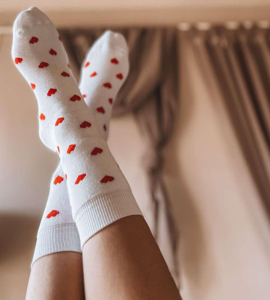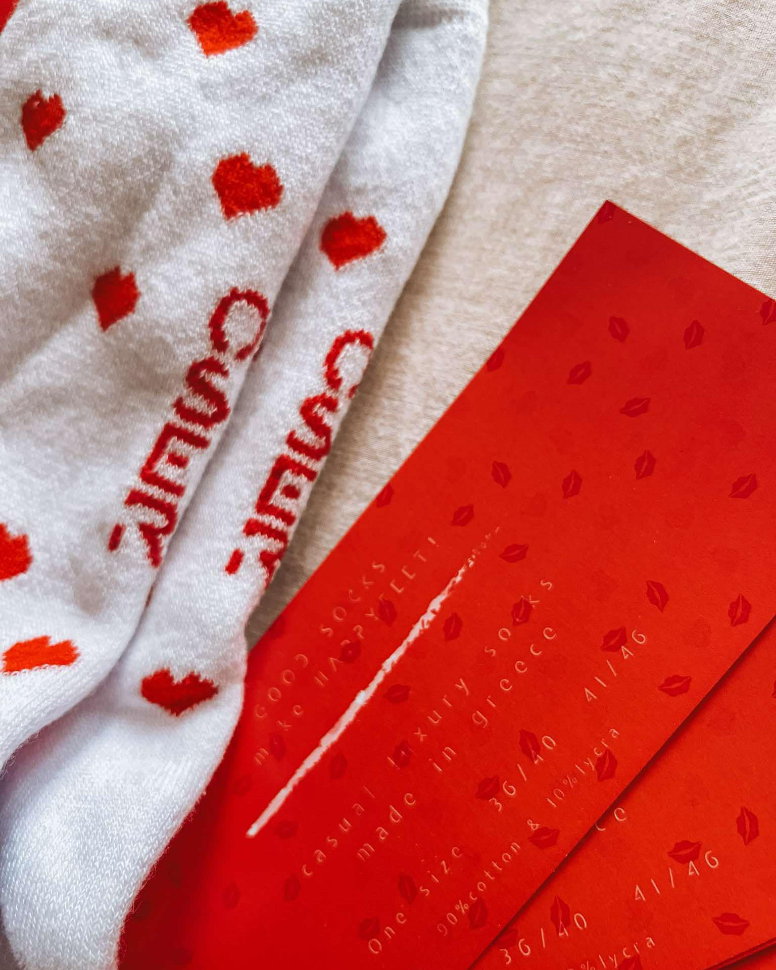 Βαμβακερές λευκές κάλτσες Oser “BitHeart”! Ψηλές λευκές κάλτσες με κόκκινες επαναλαμβανόμενες καρδούλες unisex,υψηλής ποιότητος και ελληνικής παραγωγής.