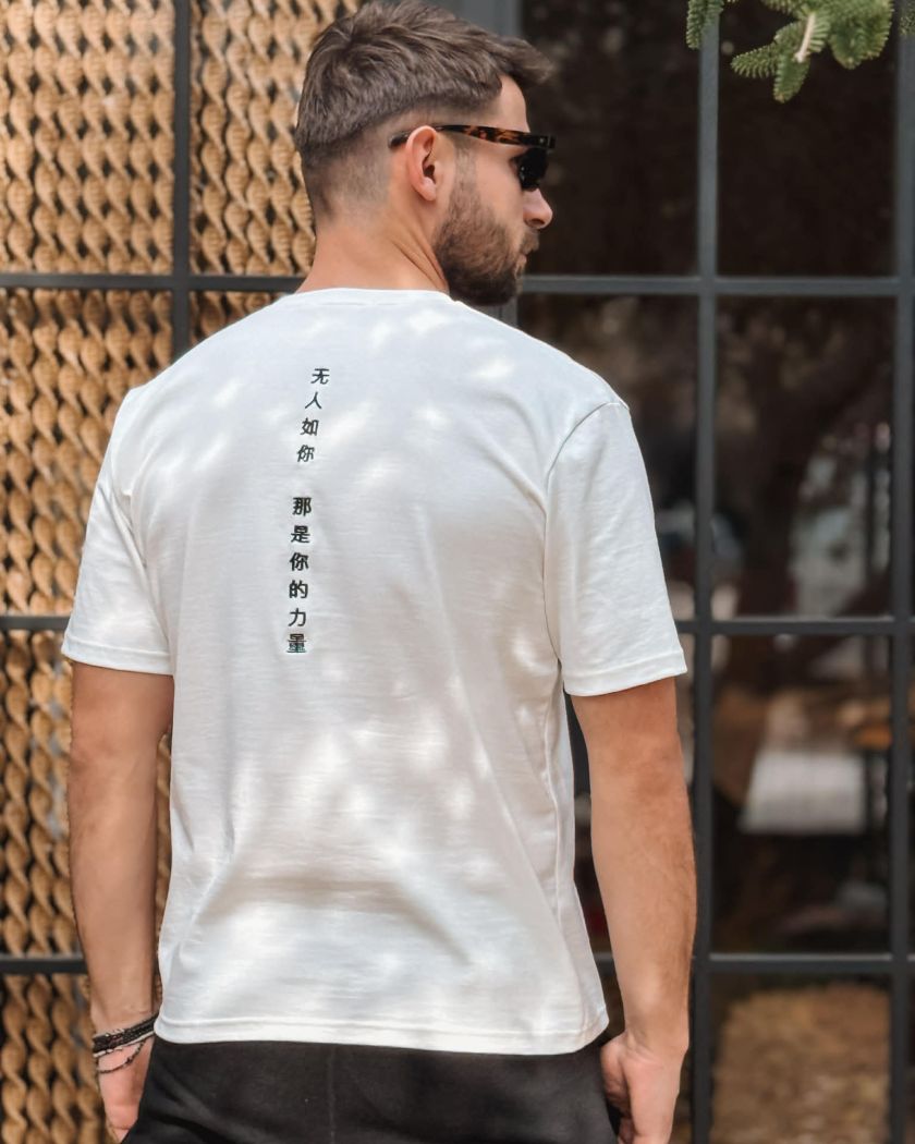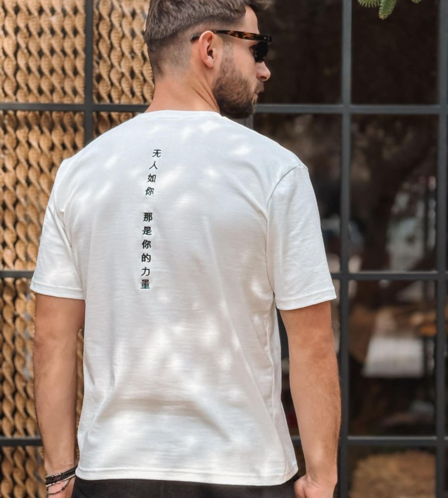 Πίσω στη πλάτη κεντημένη η η έκφραση “κανένας δεν είναι ΕΣΥ και αυτό είναι η δύναμη σου” στα κινεζικά