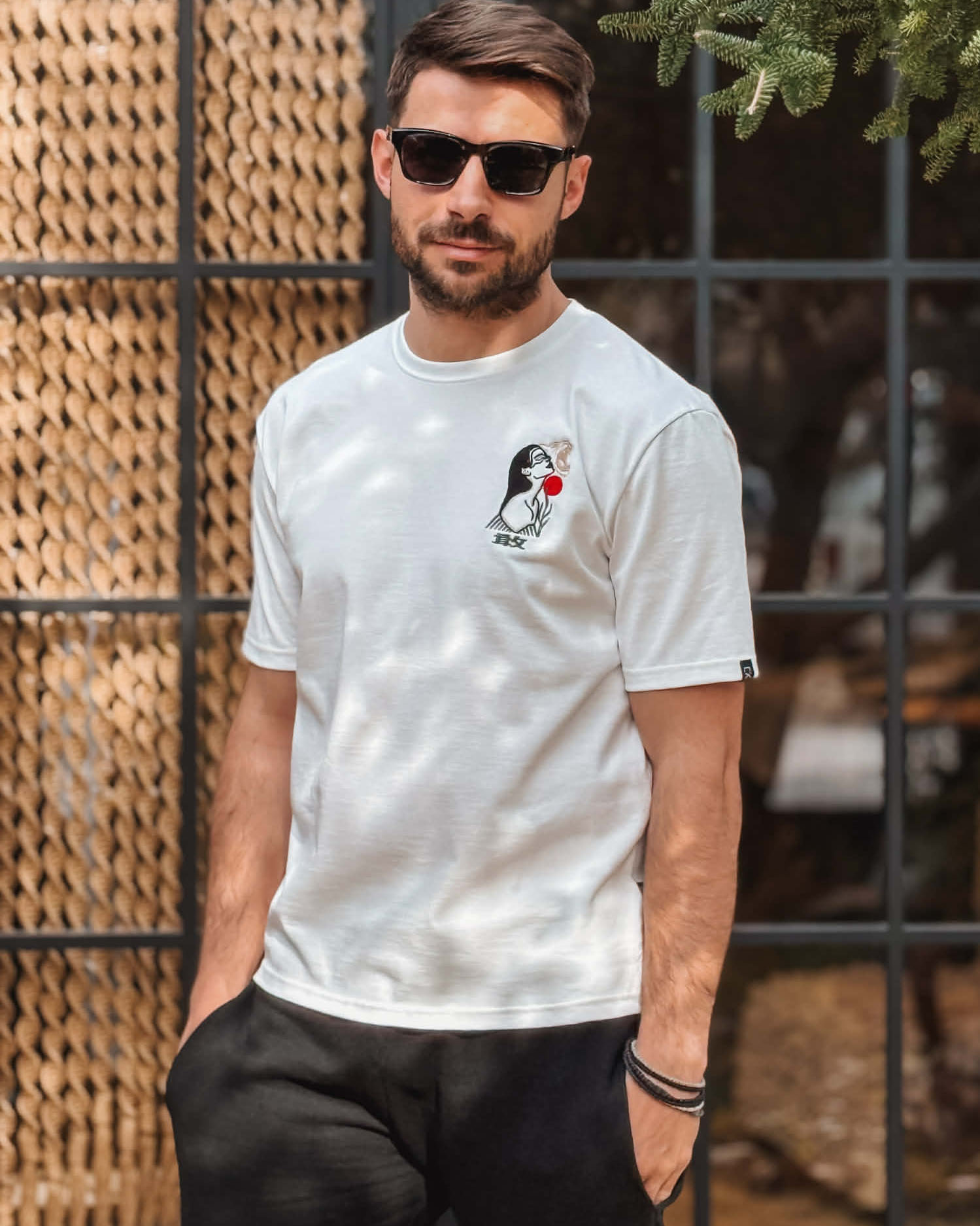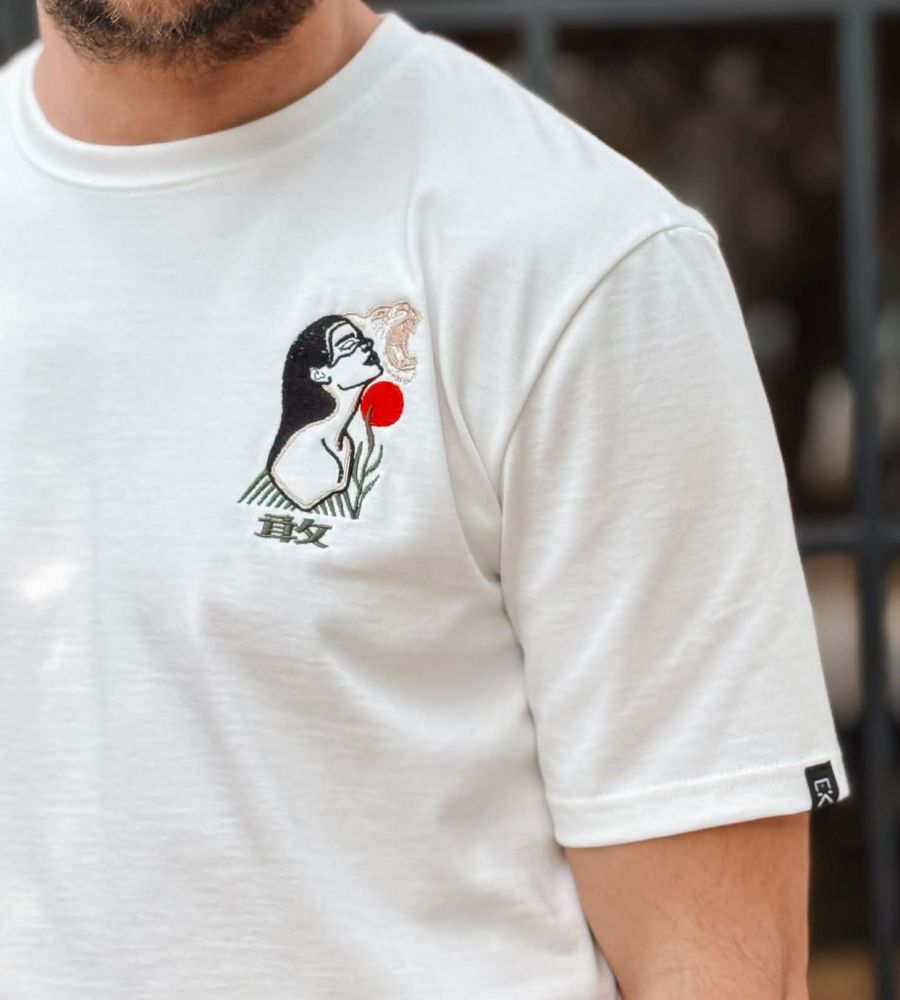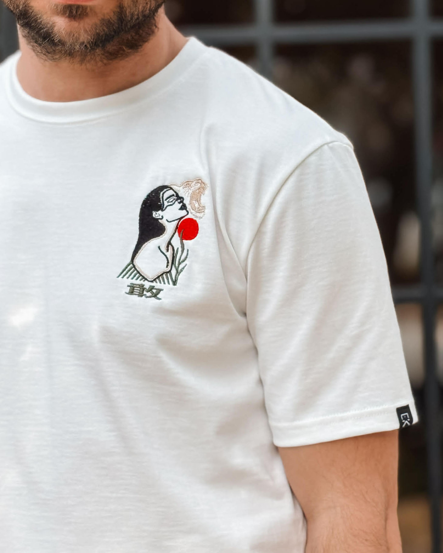 Το Τ shirt διαθέτει κεντημένο σχέδιο μια γυναικά με μάσκα και μια τίγρη που ξεπροβάλει σαν σύμβολο δύναμης από μέσα της με το λογότυπο μας στα κινεζικά. Oser (σημαίνει να τολμάς)